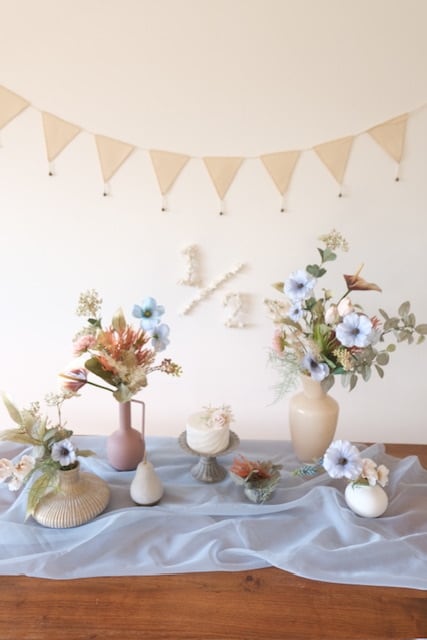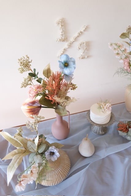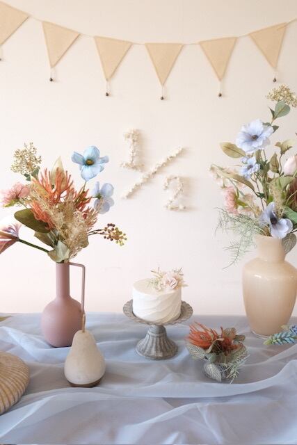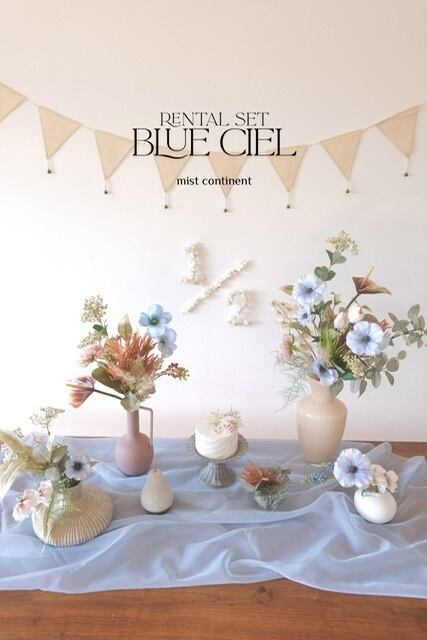 主役を引き立てつつ、フラワーベースはケーキ台は無機質にシンプルにまとめたセットです。